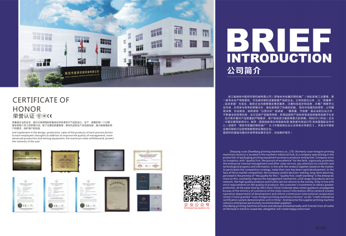 瑞安市振邦印刷機(jī)械有限公司地處浙南工業(yè)重鎮(zhèn),是一家專業(yè)生產(chǎn)外包裝印刷機(jī)設(shè)備及配套產(chǎn)品的企業(yè),主要產(chǎn)品有:柔版印刷機(jī)、模切機(jī)、檢標(biāo)機(jī)、復(fù)卷品檢機(jī)、紙吸管機(jī)分切機(jī)系列不干膠印刷設(shè)備等;是中國印刷技術(shù)協(xié)會(huì)會(huì)員單位。
